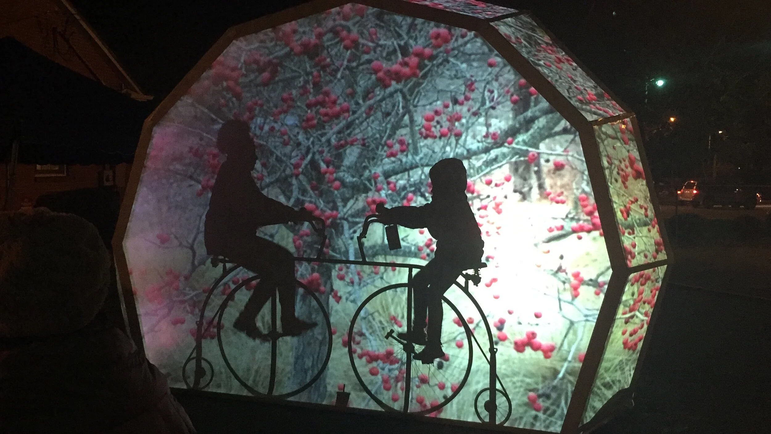 The ancient art form of shadow play accompanied with the dated process of video interests us as vehicles to create an intimate narrative between two people. As artists that explore interactivity as an important component of contemporary art, we are attracted to creating a situation in which the viewer is able to directly effect the outcome of the piece. We created a 10’ X 10’ circular wood and plastic structure that acted as a screen. Behind this screen, the viewers were invited to activate the space by performing on the fabricated steel penny farthing bicycles and along with a video composed of magnified natural environments. The video was created by Jacob Phillips and the bicycle was fabricated by Stacey Holloway. As the participants performed, their kinship with each other and the natural world are then projected to the community as an act of a healthy lifestyle.