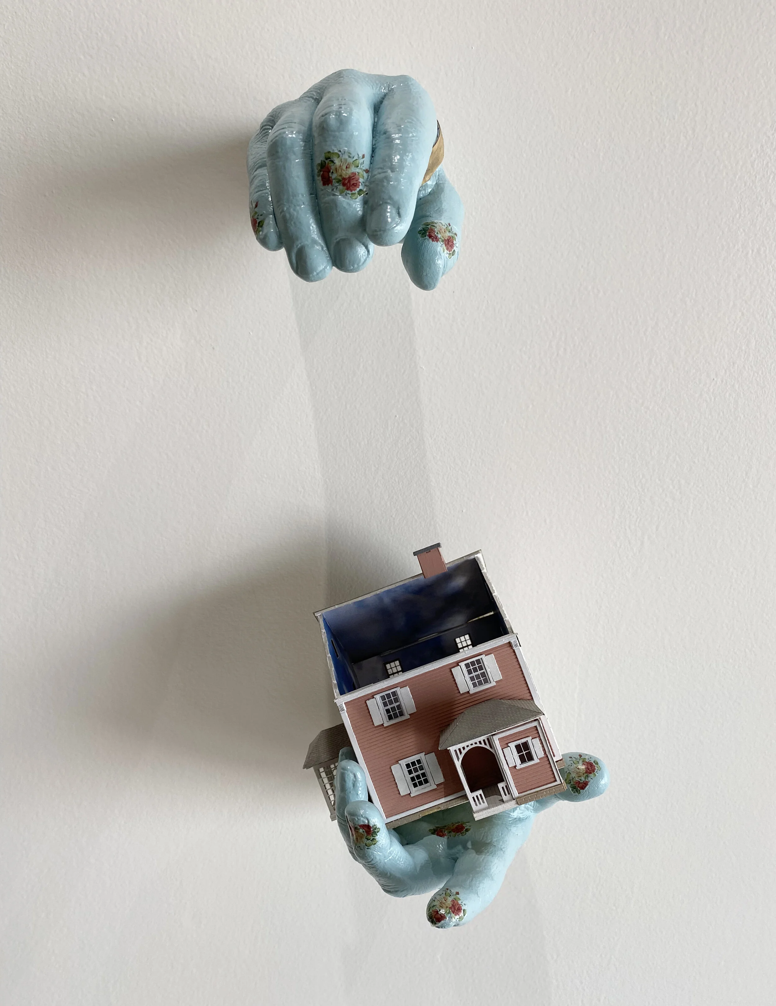 Working Hands Series (Floating on Air, Jack of All Trades, Home Sweet Home, My Cup of Tea, Ton of Bricks, Cut Loose), 2021-2025; Cast plastic and mixed media, 9’ x 2’ x 1’